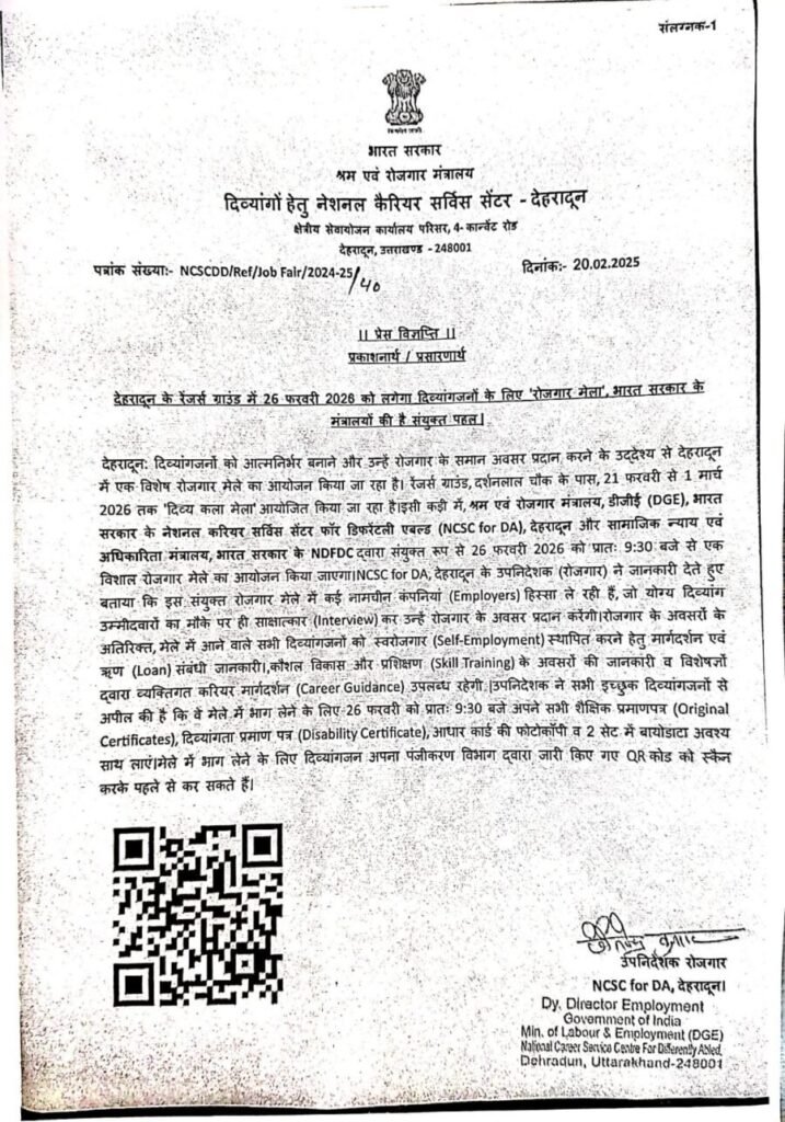 भारत सरकार के मंत्रालयों की संयुक्त पहल : देहरादून के रेंजर्स ग्राउंड में 26 फरवरी को दिव्यांगजनों के लिए विशेष “रोजगार मेला”